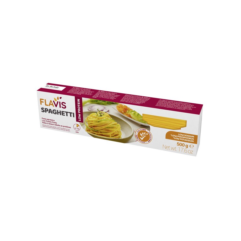 Dr. Schar Mevalia Flavis Spaghetti è una pasta aproteica, ricca in fibre, povera in sodio, potassio e fosforo. Prodotta da Dr. Schar.