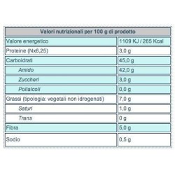 | Grassi (tipologia: vegetali non idrogenati) Saturi Trans | 7,0 g 1,0 g 0 g | Fibra | 5,0 g | Sodio | 0,5 g |