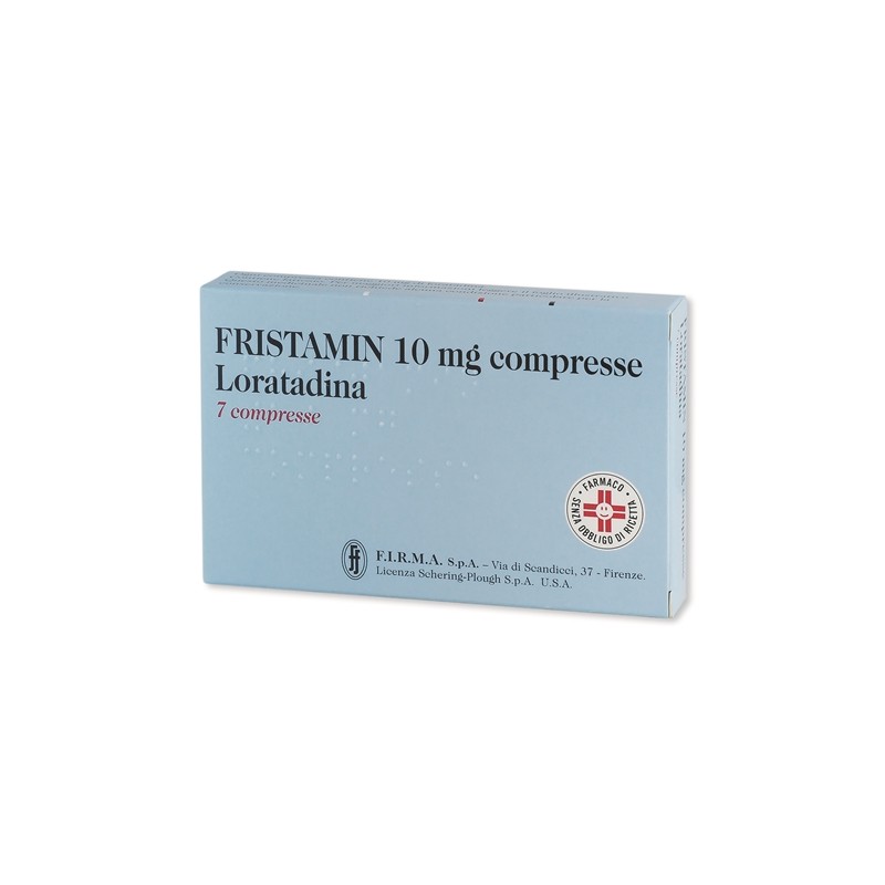 Posologia. Adulti: Una compressa una volta al giorno. Popolazione pediatrica: Bambini dai 6 anni in su con peso superiore ai 30 kg: una compressa una volta al giorno. Per un appropriato dosaggio per i bambini con età inferiore a 6 anni o di con un peso uguale o minore di 30 kg esistono altre formulazioni più indicate. Bambini con età inferiore a 2 anni: La sicurezza e l’efficacia di Fristamin non sono state stabilite. Non ci sono dati disponibili. Pazienti con compromissione epatica: Ai pazienti con grave compromissione epatica deve essere somministrata una dose iniziale inferiore poiché potrebbero avere una clearance ridotta di loratadina. Si raccomanda una dose iniziale di 10 mg a giorni alterni negli adulti e nei bambini con peso superiore ai 30 kg. Pazienti con danno renale: Non sono richiesti adattamenti di dosaggio nei pazienti con insufficienza renale. Anziani: Non sono richiesti aggiustamenti di dosaggio negli anziani. Modo di somministrazione: Uso orale. La compressa si può assumere indipendentemente dall’ora dei pasti.