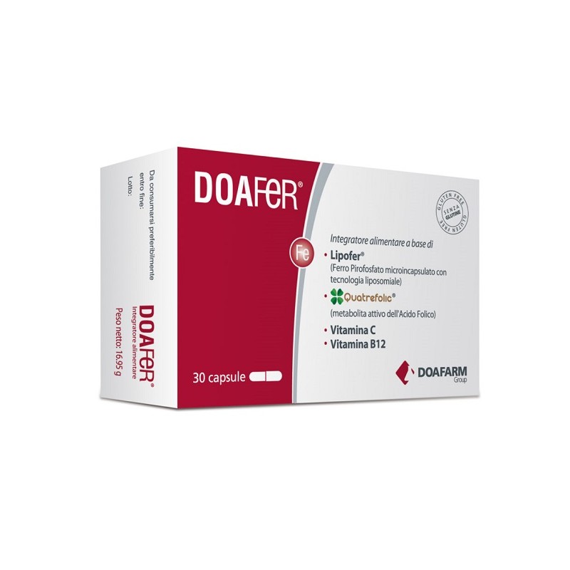 DOAFER® CAPSULE è un integratore alimentare a base di Ferro, Vitamina C, Folati e Vitamina B12. Il Ferro contribuisce alla normale formazione dei globuli rossi e dell’emoglobina, alla normale funzione del sistema immunitario e alla riduzione della stanchezza e dell’affaticamento. Il folato contribuisce alla crescita dei tessuti materni in gravidanza e interviene nel processo di divisione delle cellule. La Vitamina C accresce l’assorbimento del Ferro. La Vitamina B12 contribuisce alla normale formazione dei globuli rossi.