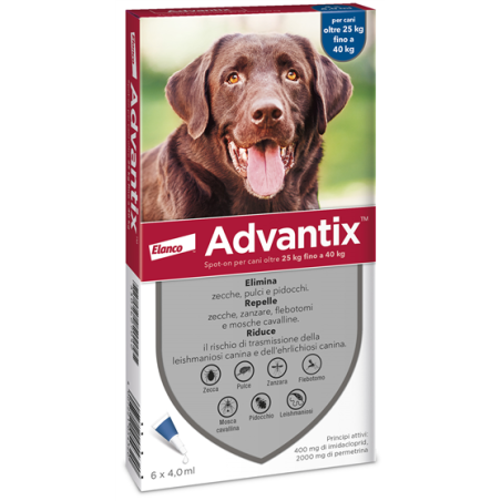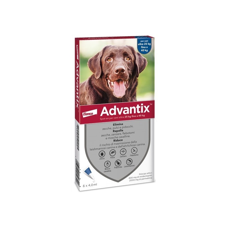 La dose minima raccomandata e': 10 mg/kg di peso corporeo (p.c.) di imidacloprid e 50 mg/kg di peso corporeo (p.c.) di permetrina. Schema posologico per Advantix Spot-on. Cani (kg peso corporeo): <= 4 kg; nome commerciale: advantix spot-on per cani fino a 4 kg; volume: 0,4 ml; imidacloprid: minimo 10 mg/kg peso corporeo; permetrina: minimo 50 mg/kg peso corporeo. Cani (kg peso corporeo): >4 kg <= 10 kg; nome commerciale: advantix spot-on per cani oltre 4 kg fino a 10 kg; volume: 1,0 ml; imidacloprid: 10 - 25 mg/kg peso corporeo; permetrina: 50 - 125 mg/kg peso corporeo. Cani (kg peso corporeo): >10 kg <= 25 kg; nome commerciale: advantix spot-on per cani oltre 10 kg fino a 25 kg; volume: 2,5 ml; imidacloprid: 10 - 25 mg/kg peso corporeo; permetrina: 50 - 125 mg/kg peso corporeo. Cani (kg peso corporeo): >25 kg <= 40 kg; nome commerciale: advantix spot-on per cani oltre 25 kg fino a 40 kg; volume: 4,0 ml; imidacloprid: 10 - 16 mg/kg peso corporeo; permetrina: 50 - 80 mg/kg peso corporeo. Per ridurre la reinfestazione dovuta alla comparsa di nuove pulci, si raccomanda di trattare tutti i cani presenti nell'ambiente domestico. Gli altri animali conviventi nello stesso ambiente domestico devono essere trattati con un prodotto idoneo. Per contribuire ulteriormente a ridurre la minaccia ambientale, si raccomanda l'uso aggiuntivo di un idoneo trattamento ambientale contro le pulci adulte ed i loro stadi in via di sviluppo. Il prodotto rimane efficace se l'animale si bagna. Si deve tuttavia evitare l'esposizione intensa e prolungata all'acqua. In caso di esposizione frequente all'acqua la persistenza dell'efficacia puo' essere ridotta. In questi casi non ripetere il trattamento piu' frequentemente di una volta alla settimana. Se per il cane e' richiesto uno shampoo, e' meglio farlo prima dell'applicazione di Advantix o almeno due settimane dopo l'applicazione, per ottimizzare l'efficacia del prodotto. In caso di infestazione da pidocchi, e' consigliata un'ulteriore visita veterinaria 30 giorni dopo il trattamento, perche' alcuni animali possono necessitare di un secondo trattamento. Per proteggere un cane per tutta la stagione dei flebotomi, il trattamento deve essere continuato in modo conforme per tutto il tempo. Solo per uso cutaneo. Applicare solamente su cute integra. Metodo di somministrazione per pipette con beccuccio applicatore corto: togliere una pipetta dalla confezione. Tenendo la pipetta in posizione verticale, ruotare e togliere il cappuccio. Rigirare il cappuccio e rimettere l'estremita' opposta sulla pipetta. Ruotare il cappuccio per rompere il sigillo e quindi rimuovere il cappuccio dalla pipetta. Per cani di 10 kg di peso corporeo o inferiore: con il cane fermo sulle quattro zampe, ripartire il mantello tra le scapole fino a rendere visibile la cute. Appoggiare l'estremita' della pipetta sulla cute e spremere piu' volte in modo deciso fino a vuotare il contenuto direttamente sulla cute. Per cani oltre 10 kg di peso corporeo: con il cane fermo sulle quattro zampe, tutto il contenuto della pipetta di Advantix deve essere applicato equamente in quattro punti sulla sommita' del dorso a partire dalle spalle fino alla base della coda. In ciascun punto, ripartire il mantello fino a rendere visibile la cute. Appoggiare l'estremita' della pipetta sulla cute e spremere delicatamente per vuotare una parte della soluzione sulla cute. Non applicare in nessuno dei punti una quantita' eccessiva di soluzione che possa far si' che una parte di quest'ultima coli lungo i fianchi del cane. Metodo di somministrazione per pipette con beccuccio applicatore lungo: togliere una pipetta dalla confezione. Tenendo la pipetta in posizione verticale, ruotare e togliere il cappuccio. Per cani di 10 kg di peso corporeo o inferiore: Con il cane fermo sulle quattro zampe, ripartire il mantello tra le scapole fino a rendere visibile la cute. Appoggiare l'estremita' della pipetta sulla cute e spremere piu' volte in modo deciso fino a vuotare il contenuto direttamente sulla cute. Per cani oltre 10 kg di peso corporeo: Con il cane fermo sulle quattro zampe, tutto il contenuto della pipetta di Advantix deve essere applicato equamente in quattro punti sulla sommita' del dorso a partire dalle spalle fino alla base della coda. In ciascun punto, ripartire il mantello fino a rendere visibile la cute. Appoggiare l'estremita' della pipetta sulla cute e spremere delicatamente per vuotare una parte della soluzione sulla cute. Non applicare in nessuno dei punti una quantita' eccessiva di soluzione che possa far si' che una parte di quest'ultima coli lungo i fianchi del cane.