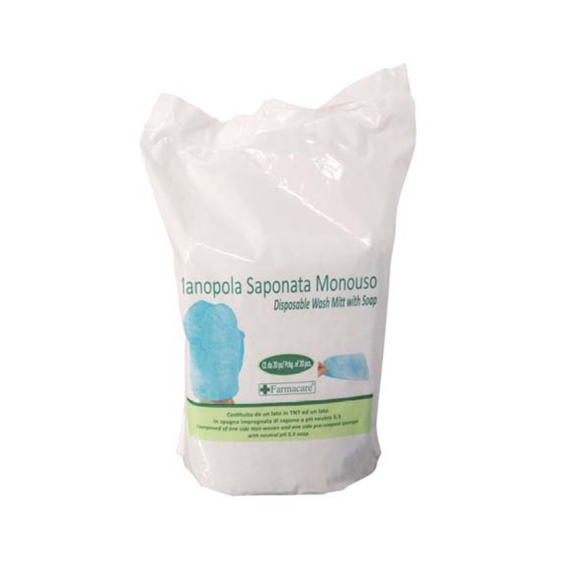 Farmacare Manopola Monouso Per Lavaggi Parziali Composta Da Una Spugna In Poliestere Saponata E Da Un Drappo In Tessuto Non Tess