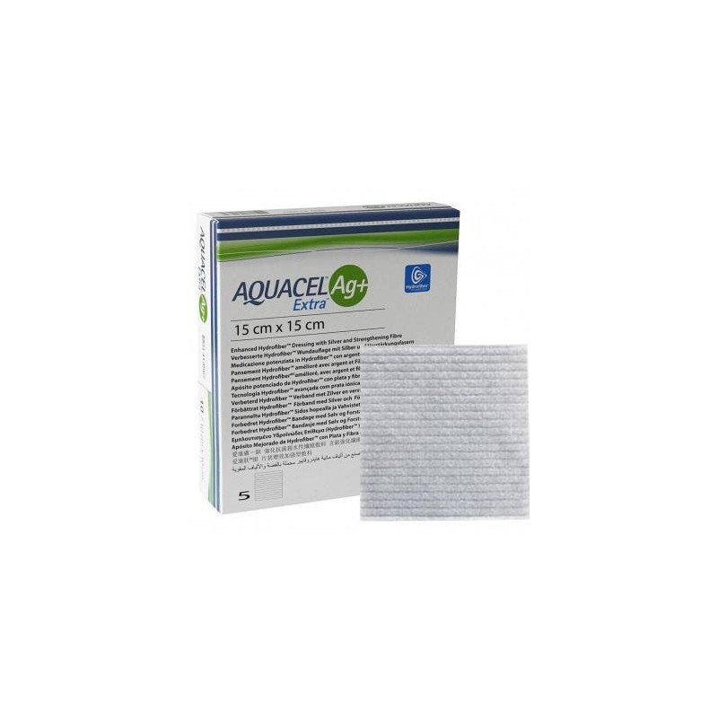 Dettagli di Convatec Italia Medicazione In Hydrofiber E Ioni Argento Intessuta In Lyocell Aquacel Ag + Extra 15x15cm 5 Pezzi