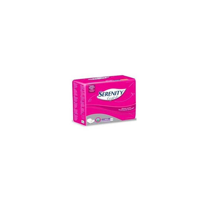 Dispositivo medico CE. Serenity Light si fissa alla normale biancheria intima, grazie alla striscia adesiva longitudinale. Il tampone assorbente sottile e compatto, permette di assorbire rapidamente e trattenere il liquido all’interno dell’assorbente, lontano dalla pelle, lasciando una sensazione di asciutto. La sua sagoma anatomica protegge dove serve, senza segnare. Le particolari fettucce elasticizzate curve, aderiscono in maniera ottimale al corpo e offrono grande comodità. L’Aloe presente sul tessuto non tessuto a contatto con la pelle offre una piacevole sensazione di delicatezza, mentre il rivestimento esterno in tessuto non tessuto traspirante favorisce la traspirabilità cutanea. In più Serenity Light è dotato del sistema Odour Zero che ostacola la formazione dei cattivi odori.