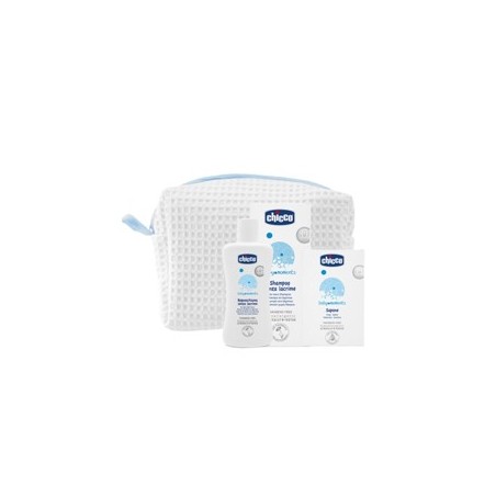 Un beauty case in cotone piquet con cerniera. Racchiude il necessario per il bagnetto del bambino. Contiene: bagnoschiuma senza lacrime, shampoo senza lacrime e sapone delicato. Colore azzurro.