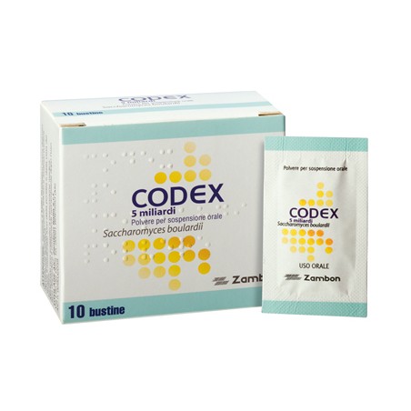 Codex 5 miliardi polvere per sospensione orale Ogni bustina contiene: principio attivo: Saccharomyces boulardii 5 miliardi di germi vivi (sotto forma di 250 mg di polvere liofilizzata). Per l’elenco completo degli eccipienti, vedere paragrafo 6.1.