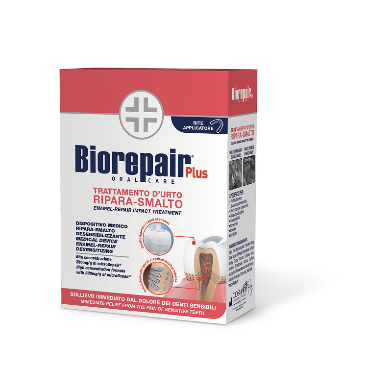 Dispositivo Medico CE. Trattamento desensibilizzante che ripara lo smalto dei denti grazie ai microRepair. Trattamento d'urto per colletti scoperti che fornisce sollievo immediato in caso di sensibilità dentinale. Può essere utilizzato in tutti i casi di sensibilità dentinale: grazie all'azione riparatrice dei microRepair, cristalli di idrossiapatite biomimetica in grado di legarsi allo smalto del dente, ripara lo smalto e crea una barriera naturale contro il dolore. È particolarmente indicato in caso di recessioni gengivali, parodontite, ipersensibilità e bruxismo; può essere inoltre utilizzato in seguito a sbiancamenti professionali o a rimozione di apparecchi ortodontici. Può essere applicato sulla superficie dei denti grazie al bite applicatore in dotazione in seguito alla propria igiene quotidiana; si consiglia l'uso del prodotto per cicli di 7/10 da ripetere una volta ogni 6 mesi o all'occorrenza.