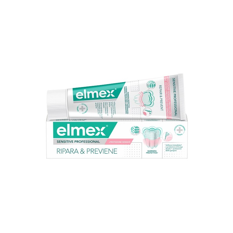 Il dentifricio Elmex sensitive ripara e previene è il dentifricio con tecnologia PRO-ARGIN e zinco un’associazione che aiuta a riparare e proteggere le aree dentali più sensibili ed allo stesso tempo prevenire la recessione gengivale, una delle cause principi della sensibilità dentale. La tecnologia Pro Argin sigilla e ripara i tubuli esposti e collegati alle terminazioni nervose donando un rapido sollievo. L’utilizzo regolare, forma una barriera protettiva che aiuta a previene la possibile di dolore e insorgenza di sensibilità dentale. La presenza di Zinco nella formulazione aiuta a rinforzare le gengive e a prevenire la recessione gengivale