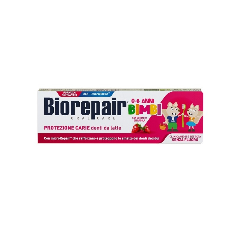 Dentifricio senza fluoro con microRepair che rinforza e remineralizza i denti dei bambini, soprattutto dopo l'uso di apparecchi ortodontici.