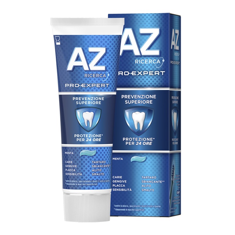 Il dentifricio AZ Pro-Expert Prevenzione Superiore protegge le 8 aree più controllate dai dentisti, proteggendo i denti da carie, placca, disturbi gengivali, sensibilità, macchie, alito cattivo, tartaro ed erosione dello smalto.
