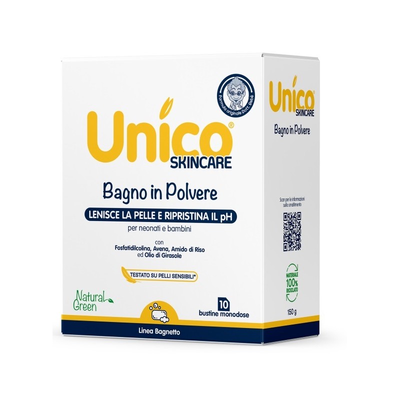 Unico bagno polvere è una composizione a base di amido di riso micronizzato, avena colloidale, lecitina di soia.