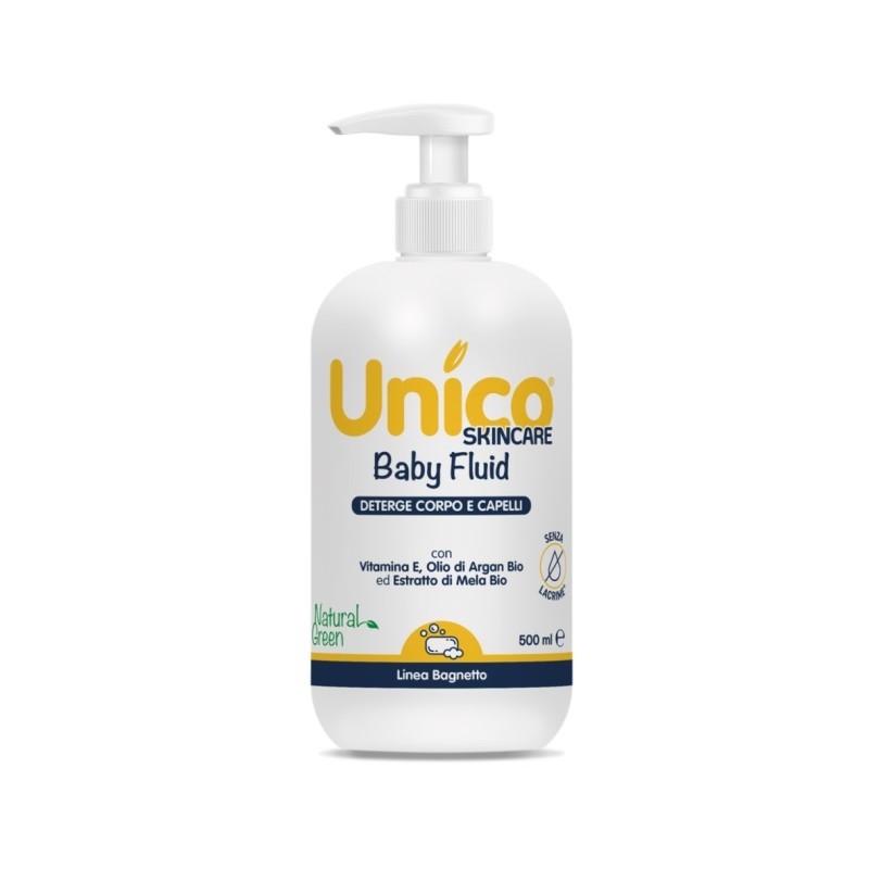 Unico Baby Fluid Bagno doccia gel per neonati e bambini. Idratante liquido, emolliente e lenitivo a base di avena.