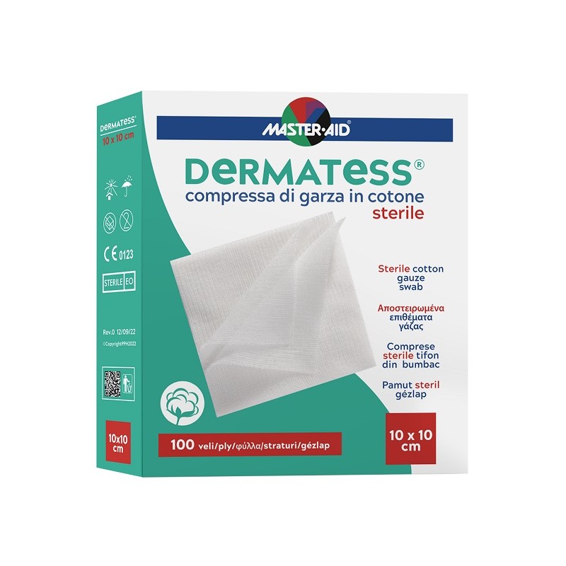 Dispositivo medico CE 0373. Morbide compresse di garza idrofila. Non si attaccano alla ferita, non sfilacciano ed hanno un elevato potere di assorbimento. Sterili.
