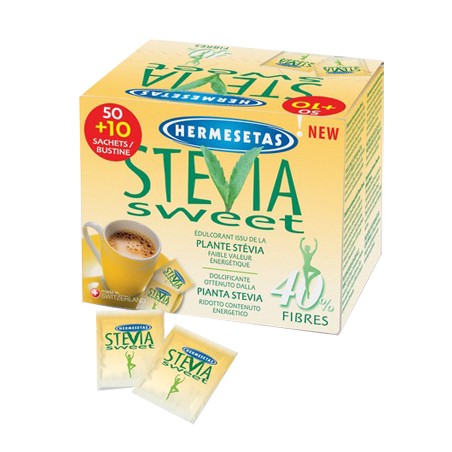 SteviaSweet Hermesetas bustine contiene un dolcificante con un apporto calorico ridotto, ottenuto dalla parte più aromatica della pianta Stevia rebaudiana, ideale per il tè, le tisane, il caffè e ogni altro tipo di bevanda calda. Contiene inoltre il 40% di fibre alimentari.