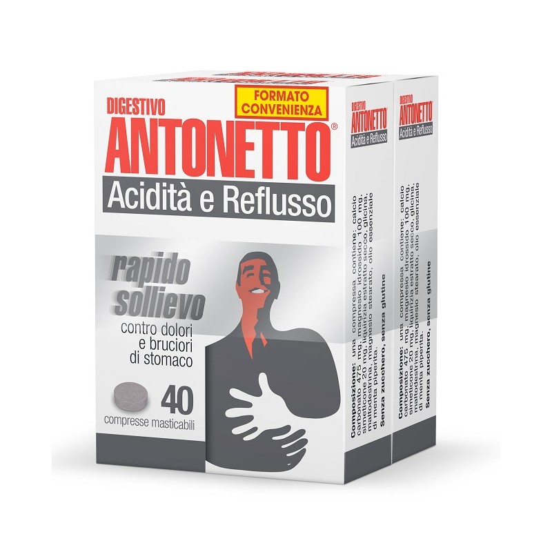 Rapido sollievo contro dolori e bruciori di stomaco. La formula del Digestivo Antonetto, infatti, è stata studiata per coniugare rapidità e praticità di assunzione: le compresse, masticate, neutralizzano prontamente l'eccessiva acidità donando un rapido sollievo.