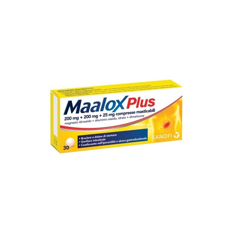 MAALOX PLUS 3,65% + 3,25% + 0,5% sospensione orale Posologia Non superare le dosi massime indicate se non su prescrizione medica. Ingerire 2-4 cucchiaini (10-20 ml) 4 volte al giorno, 20-60 minuti dopo i pasti e prima di coricarsi. Modo di somministrazione Agitare bene prima dell’uso. Può essere diluito in acqua o latte. MAALOX PLUS 200 mg + 200 mg + 25 mg compresse masticabiliPosologia Non superare le dosi massime indicate se non su prescrizione medica. 2-4 compresse 4 volte al dì ben masticate o succhiate, 20-60 minuti dopo i pasti e prima di coricarsi. Modo di somministrazione Le compresse devono essere ben masticate o succhiate. La loro assunzione può essere seguita da ingestione di acqua o latte. Popolazione pediatrica Non è raccomandata la somministrazione del medicinale in età pediatrica.