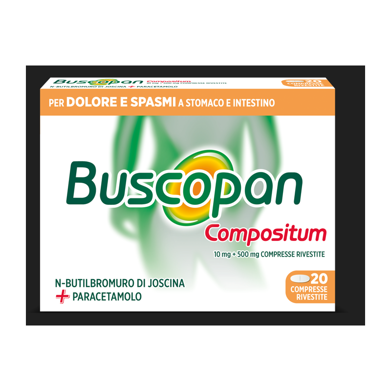 Buscopan Compositum 10 mg + 500 mg compresse rivestite Una compressa rivestita contiene: Principi attivi: N-butilbromuro di joscina 10 mg, paracetamolo 500 mg Buscopan Compositum 10 mg + 800 mg supposte Una supposta contiene: Principi attivi: N-butilbromuro di joscina 10 mg, paracetamolo 800 mg Eccipiente con effetti noti: sodio. Per l’elenco completo degli eccipienti, vedere paragrafo 6.1.