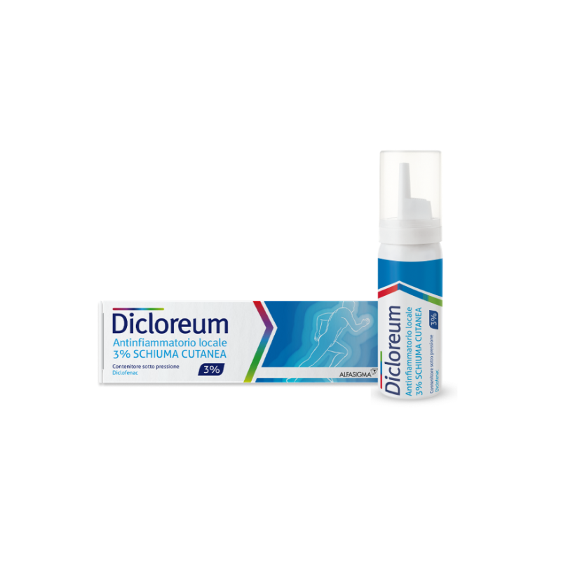 Adulti al di sopra dei 18 anni: Applicare DICLOREUM ANTINFIAMMATORIO LOCALE 1–3 volte al giorno o secondo prescrizione medica. Per ogni applicazione spruzzare sul palmo della mano, a seconda delle dimensioni della zona da trattare, una massa circolare di schiuma di 3–5 centimetri di diametro (pari a circa 0,75–1,5 grammi in peso) massaggiando delicatamente fino a completo assorbimento. In caso di trattamento per ionoforesi il prodotto deve essere applicato al polo negativo. DICLOREUM ANTINFIAMMATORIO LOCALE può essere inoltre usato in combinazione con la terapia ad ultrasuoni. Dopo l’applicazione, lavarsi le mani, altrimenti risulteranno anch’esse trattate con la schiuma cutanea. Attenzione: usare solo per brevi periodi di trattamento. Adolescenti dai 14 ai 18 anni: Applicare DICLOREUM ANTINFIAMMATORIO LOCALE 1–3 volte al giorno o secondo prescrizione medica. Per ogni applicazione spruzzare sul palmo della mano, a seconda delle dimensioni della zona da trattare, una massa circolare di schiuma di 3–5 centimetri di diametro (pari a circa 0,75–1,5 grammi in peso) massaggiando delicatamente fino a completo assorbimento. In caso di trattamento per ionoforesi il prodotto deve essere applicato al polo negativo. DICLOREUM ANTINFIAMMATORIO LOCALE può essere inoltre usato in combinazione con la terapia ad ultrasuoni. Dopo l’applicazione, lavarsi le mani, altrimenti risulteranno anch’esse trattate con la schiuma cutanea. Se questo medicinale è necessario per più di 7 giorni per alleviare il dolore o se i sintomi peggiorano, consultare il medico. Bambini ed adolescenti al di sotto dei 14 anni: Sono disponibili dati insufficienti sull’efficacia e la sicurezza nei bambini e negli adolescenti al di sotto dei 14 anni (vedere anche la sezione 4.3 Controindicazioni). Pertanto, l’uso di DICLOREUM ANTINFIAMMATORIO LOCALE è controindicato nei bambini al di sotto dei 14 anni di età. Anziani: Può essere impiegato il dosaggio abituale previsto per gli adulti. Modalità d’uso: Agitare prima dell’uso. Tenendo la bomboletta capovolta, erogare la quantità desiderata premendo l’apposito erogatore.