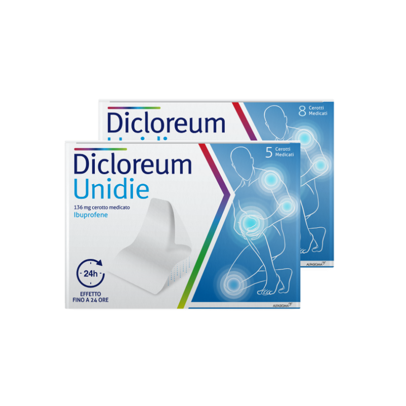 I livelli plasmatici di ibuprofene raggiunti dopo la somministrazione del cerotto medicato sono molto più bassi di quelli ottenuti mediante somministrazione sistemica e pertanto l’insorgenza di effetti collaterali sistemici è verosimile che sia molto ridotta rispetto all’uso sistemico. Tuttavia, se i cerotti medicati sono utilizzati per un periodo di tempo prolungato non è possibile escludere la possibilità di eventi avversi sistemici. Gli effetti indesiderati possono essere minimizzati con l’uso della più bassa dose efficace per la più breve durata possibile di trattamento che occorre per controllare i sintomi. Gli analgesici, antipiretici ed antiinfiammatori non steroidei (FANS non selettivi ed inibitori selettivi della COX-2), compreso l’ibuprofene, possono causare reazioni di ipersensibilità, potenzialmente gravi, in soggetti non precedentemente esposti a questo tipo di farmaci. Queste reazioni comprendono attacchi d’asma, eruzioni cutanee, riniti allergiche e reazioni di tipo anafilattico. Come altri FANS, ibuprofene può mascherare segni di infezione. Anziani: si deve usare cautela nel trattamento di pazienti anziani che sono generalmente più predisposti agli eventi avversi. Pazienti asmatici, con malattie ostruttive dei bronchi, riniti allergiche o infiammazione della mucosa nasale (polipo nasale) reagiscono più spesso di altri pazienti al trattamento effettuato con FANS, con attacchi asmatici, infiammazione locale della pelle e della mucosa (edema di Quincke) o orticaria. Durante il trattamento con tutti i FANS, in qualsiasi momento, con o senza sintomi di preavviso o precedente storia di gravi eventi gastrointestinali, sono state riportate emorragia gastrointestinale, ulcerazione e perforazione, che possono essere fatali. Usare cautela nel somministrare Dicloreum Unidie in pazienti con anamnesi di ulcera peptica o di emorragia gastrointestinale non secondaria alla somministrazione di FANS e nei casi di colite ulcerosa e morbo di Crohn. Pazienti con storia di tossicità gastrointestinale, in particolare anziani, devono riferire qualsiasi sintomo gastrointestinale inusuale (soprattutto emorragia gastrointestinale) in particolare nelle fasi iniziali del trattamento. Cautela deve essere prestata ai pazienti che assumono farmaci concomitanti che potrebbero aumentare il rischio di ulcerazione o emorragia, come corticosteroidi orali, anticoagulanti come warfarin, inibitori selettivi del reuptake della serotonina o agenti antiaggreganti come l’aspirina (vedere paragrafo 4.5). Quando si verifica emorragia o ulcerazione gastrointestinale in pazienti che assumono Dicloreum Unidie, il trattamento deve essere sospeso. È inoltre sconsigliato in caso di diatesi emorragica, gravi disfunzioni epatiche o renali ed in casi di insufficienza cardiaca. Cautela deve essere prestata nei pazienti con anamnesi positiva per ipertensione e/o insufficienza cardiaca congestizia da lieve a moderata poiché in associazione al trattamento con i FANS sono stati riscontrati ritenzione di liquidi ed edema. I FANS possono ridurre l’effetto dei diuretici, e di altri farmaci antiipertensivi (vedere paragrafo 4.5). Ibuprofene può causare ritenzione idrica e di sodio, potassio in pazienti che non hanno mai sofferto di disturbi renali a causa dei suoi effetti sulla perfusione renale. Ciò può causare edema o insufficienza cardiaca o ipertensione in pazienti predisposti. L’utilizzo a lungo termine di ibuprofene, come con altri FANS, ha portato a necrosi papillare renale ed altre alterazioni patologiche renali. Ibuprofene, come altri FANS, può inibire l’aggregazione piastrinica e ha dato evidenza di prolungare il tempo di sanguinamento in soggetti sani. Pertanto, i pazienti con difetti della coagulazione o in terapia anticoagulante devono essere osservati attentamente. In rare occasioni in pazienti in trattamento con ibuprofene è stata osservata meningite asettica. L’uso prolungato o ripetuto di prodotti per uso cutaneo può dare origine a fenomeni locali di sensibilizzazione. Gli analgesici, antipiretici, antinfiammatori non-steroidei possono causare reazioni di ipersensibilità, potenzialmente gravi (reazioni anafilattoidi), anche in soggetti non precedentemente esposti a questo tipo di farmaci. Il rischio di reazioni di ipersensibilità dopo assunzione di ibuprofene è maggiore nei soggetti che abbiano presentato tali reazioni dopo l’uso di altri analgesici, antipiretici, antinfiammatori non-steroidei e nei soggetti con iperreattività bronchiale (asma), febbre da fieno, poliposi nasale o malattie respiratorie croniche ostruttive o precedenti episodi di angioedema. Nelle prime fasi della terapia i pazienti sembrano essere a più alto rischio: l’insorgenza della reazione si verifica nella maggior parte dei casi entro il primo mese di trattamento. Reazioni di ipersensibilità gravi (ad esempio shock anafilattico) sono state osservate raramente. In presenza di reazioni avverse importanti (reazioni cutanee quali dermatite esfoliativa, sindrome di Stevens-Johnson e necrolisi tossica epidermica) e reazioni di ipersensibilità è necessario interrompere immediatamente la terapia e consultare il medico ai fini della istituzione di una terapia idonea. Dopo breve terapia senza risultati apprezzabili, consultare il medico. Non c’è esperienza sull’uso di Dicloreum Unidie nei bambini e pertanto se ne sconsiglia l’utilizzo in soggetti età inferiore a 12 anni.