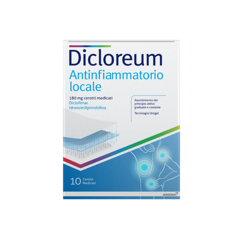 Se i cerotti medicati di diclofenac vengono utilizzati su superfici cutanee estese e per un periodo di tempo prolungato non è possibile escludere la possibilità di eventi avversi sistemici (consultare il Riassunto delle Caratteristiche del Prodotto delle formulazioni sistemiche di diclofenac). Il cerotto medicato deve essere applicato solo sulla cute intatta e sana e non deve essere applicato sulla cute lesa o su ferite aperte. I cerotti non devono entrare in contatto con gli occhi o le membrane mucose. Gli effetti indesiderati possono essere minimizzati con l’uso della più bassa dose efficace per la più breve durata possibile di trattamento che occorre per controllare i sintomi. • Non utilizzare con un bendaggio occlusivo che non lascia passare aria. • Il trattamento deve essere interrotto immediatamente se si sviluppa un rash cutaneo dopo l’applicazione del cerotto medicato. • Non somministrare contemporaneamente per via topica o sistemica un altro medicinale a base di diclofenac o altri FANS. • Sebbene gli effetti sistemici dovrebbero essere limitati, il cerotto medicato deve essere utilizzato con cautela in pazienti con compromissione renale, cardiaca o epatica, storia di ulcera peptica o malattia infiammatoria intestinale o diatesi emorragica. I farmaci antinfiammatori non steroidei devono essere utilizzati con particolare attenzione nei pazienti anziani che sono maggiormente predisposti agli effetti indesiderati. • Questo medicinale contiene metile paraidrossibenzoato e propile paraidrossibenzoato. Possono causare reazioni allergiche (anche ritardate). Contiene anche glicole propilenico, che può causare irritazione cutanea. • I pazienti devono essere avvertiti di non esporsi alla luce solare diretta o alla luce delle lampade solari per circa un giorno dopo la rimozione del cerotto medicato in modo da ridurre il rischio di fotosensibilità. Informazioni importanti su alcuni eccipienti: Dicloreum antinfiammatorio locale contiene metile paraidrossibenzoato e propile paraidrossibenzoato che possono causare reazioni allergiche (anche ritardate).