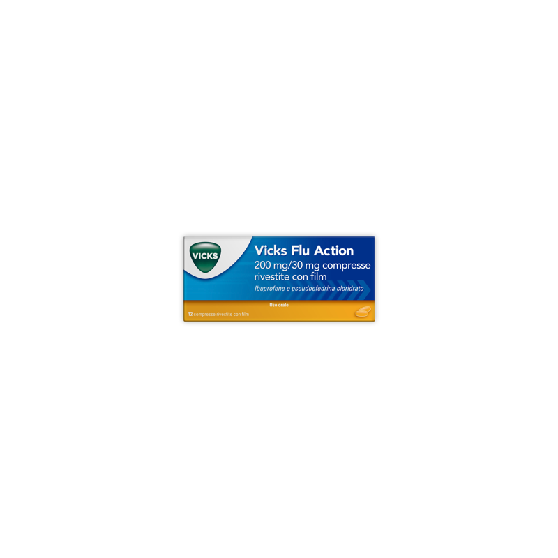 Posologia Adulti e adolescenti di età pari o superiore a 15 anni: 1 compressa (equivalente a 200 mg di ibuprofene e 30 mg di pseudoefedrina cloridrato) ogni 4–6 ore al bisogno. Per i sintomi più gravi, 2 compresse (equivalenti a 400 mg di ibuprofene e 60 mg di pseudoefedrina cloridrato) ogni 6–8 ore al bisogno, fino alla dose massima giornaliera totale. La dose massima giornaliera totale di 6 compresse (equivalenti a 1200 mg di ibuprofene e 180 mg di pseudoefedrina cloridrato) non deve essere superata. Non superare i 5 giorni di terapia per la popolazione adulta. Non superare i 3 giorni di terapia per gli adolescenti (15–18 anni). Questo prodotto di associazione deve essere usato quando sono necessarie sia l’azione decongestionante della pseudoefedrina cloridrato sia quella analgesica e/o antinfiammatoria dell’ibuprofene. Se un sintomo è predominante (congestione nasale o cefalea e/o febbre), è preferibile una terapia con un singolo principio attivo. Nei pazienti più anziani e nei pazienti con anamnesi di ulcere, in particolare se complicate da emorragia o perforazione (vedere paragrafo 4.3), avviare la terapia con la dose minima possibile perché il rischio di emorragia, ulcera o perforazione gastrointestinale è maggiore con l’aumentare delle dosi di FANS. In questi pazienti, o nei pazienti che assumono altri farmaci in grado di aumentare il rischio di eventi gastrointestinali (vedere più sotto e al paragrafo 4.5), si deve considerare l’uso concomitante di agenti protettivi (misoprostolo o inibitori della pompa protonica). Nei pazienti con disturbi renali o epatici è necessario adattare il dosaggio al singolo paziente. Gli effetti indesiderati possono essere ridotti usando la dose minima efficace per la durata minima necessaria ad alleviare i sintomi (vedere paragrafo 4.4). Popolazione pediatrica Vicks Flu Action è controindicato nei bambini di età inferiore a 15 anni (vedere paragrafo 4.3). Modo di somministrazione Per uso orale. Le compresse devono essere deglutite con acqua, preferibilmente a stomaco pieno. Non spezzare o frantumare le compresse.
