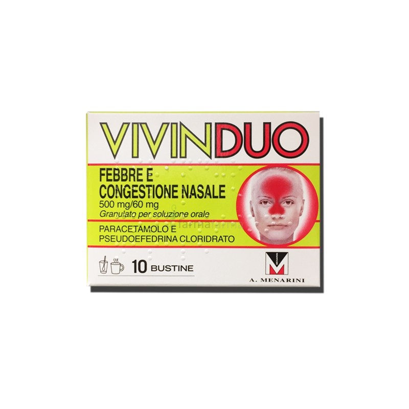 Vivinduo febbre e congestione nasale è un farmaco granulato per soluzione orale utile per chi soffre di sintomi del raffreddore e dell'influenza. Prodotto da Manearini Industrie Famaceutiche Riunite s.r.l.