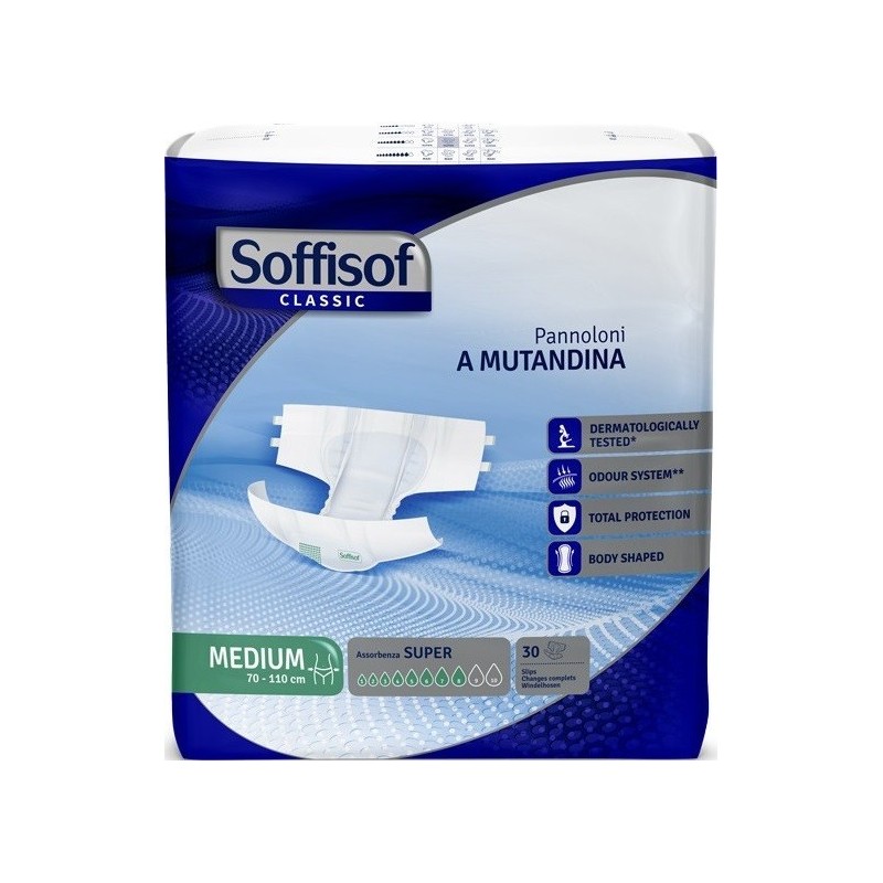 Il Pannolone a Mutandina Soffisof Classic Super è indicato per incontinenza urinaria e/o fecale da media a grave e assicura la massima sicurezza e comfort a utilizzatori sia autosufficienti che allettati.