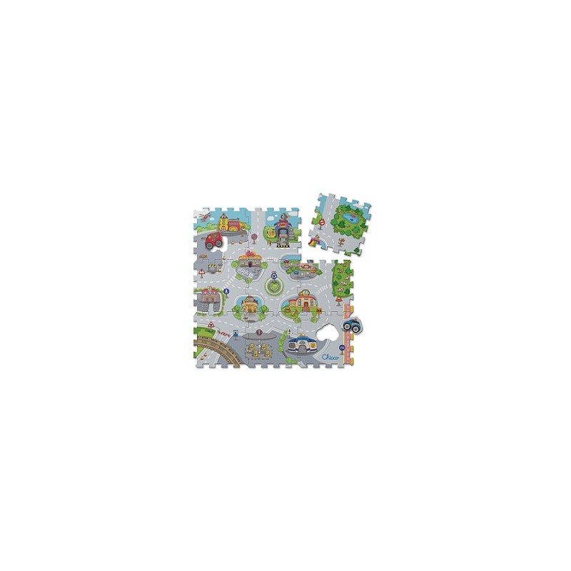 Tappeti puzzle a 9 elementi con superficie morbida e confortevole per far giocare il bambino e guidarlo alla scoperta di due nuovi scenari da comporre e con cui vivere tante avventure divertenti. Nel Tappeto Puzzle Città il bambino può giocare a guidare gli automezzi attraverso le strade e i luoghi della città, imitando i viaggi quotidiani con mamma e papà. Il camion dei pompieri e l'auto della polizia sono staccabili.