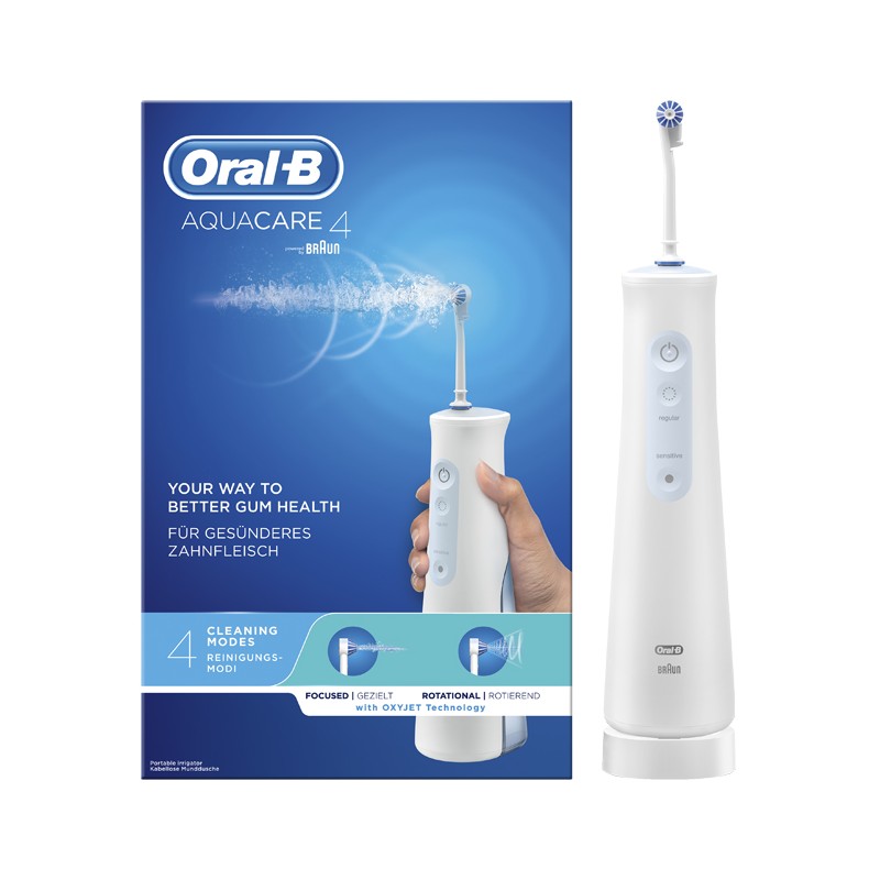 Oral-B Idropulsore Acquacare 4 con tecnologia Oxyjet genera nell’acqua microbollicine di aria purificata per aiutare a migliorare la salute delle gengive con un delicato massaggio gengivale. Prodotto da Procter & Gamble.