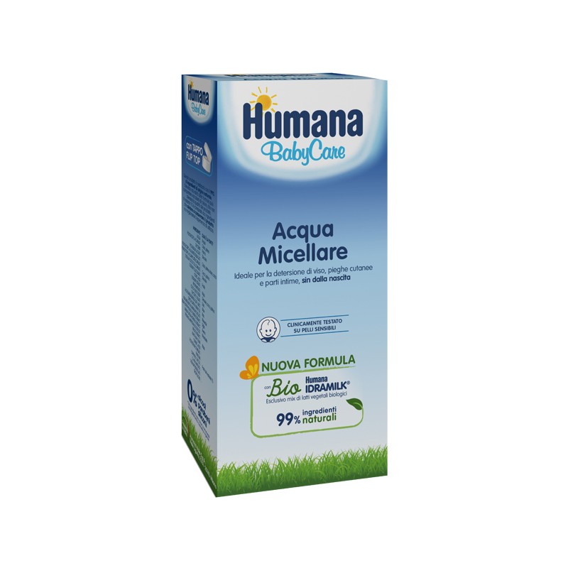 Humana Baby Care Acqua Micellare è un acqua micellare ideale per la detersione di viso, pieghe cutanee e parti intime, sin dalla nascita.