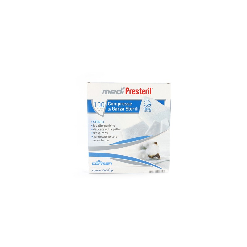 Compresse di garza sterili ipoallergeniche 100% cotone, delicate sulla pelle, traspiranti, ad elevato potere assorbente.