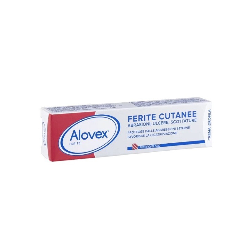 Alovex Ferite è una crema che forma una barriera protettiva a livello della cute lesa e agevola quindi i processi riparativi, grazie alla presenza di acido ialuronico e argento metallico. Prodotto da Recordati.