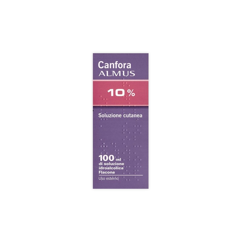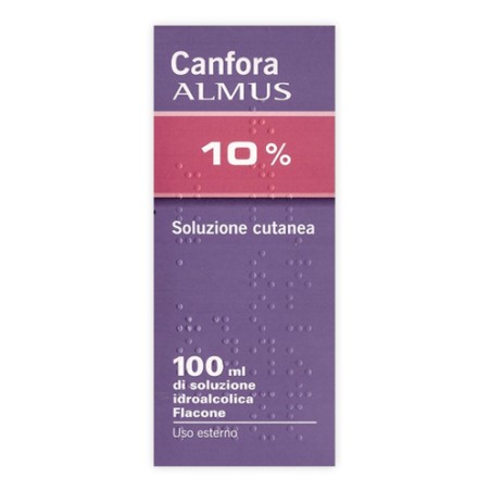 Questo prodotto contiene derivati terpenici che, in dosi eccessive, possono provocare disturbi neurologici come convulsioni in neonati e bambini. Il trattamento non deve essere prolungato per più di 3 giorni per i rischi associati all’accumulo di derivati terpenici quali ad esempio canfora, cineolo, niaouli, timo selvatico, terpineolo, terpina, citrale, mentolo e oli essenziali di aghi di pino, eucalipto e trementina (a causa delle loro proprietà lipofiliche non è nota la velocità di metabolismo e smaltimento) nei tessuti e nel cervello, in particolare disturbi neuropsicologici. Non deve essere utilizzata una dose superiore a quella raccomandata per evitare un maggior rischio di reazioni avverse al medicinale e i disturbi associati al sovradosaggio (vedere paragrafo 4.9). Il prodotto è infiammabile, non deve essere avvicinato a fiamme. Non usare soluzioni a base di canfora concentrate, contenenti più dell’11% di canfora, perché possono essere irritanti e pericolose. Non ingerire la soluzione di canfora, in quanto può causare effetti indesiderati gravi, compreso il decesso. Canfora soluzione cutanea non deve essere applicata sulle narici dei bambini anche in piccola quantità perché potrebbe causare shock. Informazioni importanti su alcuni eccipienti: Canfora Almus 10% soluzione cutanea, 1 flacone 100 ml soluzione oleosa contiene olio di arachidi raffinato. Non utilizzare questo medicinale in caso di allergia alle arachidi o alla soia. Canfora Almus 10% soluzione cutanea, 1 flacone 100 ml soluzione idroalcolica contiene idrossianisolo butilato e idrossitoluene butilato che possono causare reazioni cutanee locali (ad es. dermatiti da contatto) o irritazione degli occhi e delle mucose.