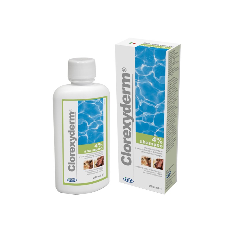 shampoo disinfettante a base di clorexidina digluconato, molecola ad ampio spettro d’azione antibatterica usata da lungo tempo per uso umano e veterinario.