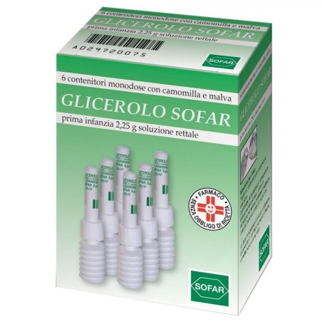 GLICEROLO Sofar Prima infanzia/Bambini 2,25 g soluzione rettale Ogni contenitore monodose contiene: principio attivo: Glicerolo 2,25 g GLICEROLO Sofar Adulti 6,75 g soluzione rettale Ogni contenitore monodose contiene: principio attivo: Glicerolo 6,75 g Per l’elenco completo degli eccipienti vedere paragrafo 6.1.