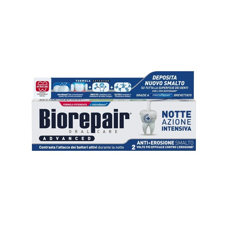 La formula avanzata Biorepair Intensivo Notte Anti-Erosione è potenziata per contrastare il processo di demineralizzazione dello smalto dei denti che avviene durante la notte. I microRepair, presenti in alta concentrazione, si depositano sullo smalto riparandolo e proteggendo la superficie dei denti dall'erosione notturna. Zinco, PCA e xilitolo contrastano insieme l'attività aggressiva degli acidi dei batteri, principale causa di demineralizzazione, placca, tartaro e carie. Inoltre lo speciale aroma stimola il flusso salivare notturno per una protezione naturale dello smalto e un alito più fresco al risveglio.