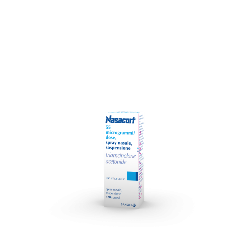 Posologia Adulti: La dose iniziale raccomandata è di 220 microgrammi corrispondente a 2 spruzzi in ciascuna narice una volta al giorno. Una volta che i sintomi sono sotto controllo i pazienti possono essere sottoposti a terapia di mantenimento con 110 microgrammi (corrispondenti ad uno spruzzo per narice una volta al giorno). Popolazione pediatrica Bambini con età dai 12 anni in poi: La dose iniziale raccomandata è di 220 microgrammi corrispondenti a 2 spruzzi per narice una volta al giorno. Una volta controllati i sintomi, i pazienti possono essere mantenuti con 110 microgrammi (1 spruzzo per narice una volta al giorno). Bambini dai 6 ai 12 anni: La dose raccomandata è di 110 microgrammi corrispondente a 1 spruzzo in ciascuna narice una volta al giorno. In pazienti con sintomi più gravi, può essere usata una dose di 220 microgrammi. Una volta raggiunto il controllo dei sintomi, i pazienti devono essere sottoposti a terapia di mantenimento con la minima dose efficace (vedere paragrafi 4.4 e 5.1). Bambini dai 2 ai 5 anni: La dose raccomandata e massima è 110 microgrammi corrispondenti a 1 spruzzo in ogni narice una volta al giorno (vedere paragrafi 4.4 e 5.1). Non è consigliato l’uso continuato oltre i 3 mesi nei bambini al di sotto dei 12 anni. Modo di somministrazione: NASACORT è solo per uso intranasale. È importante agitare il flacone delicatamente prima di ogni uso. Il dispositivo nasale eroga 55 mcg di triamcinolone acetonide per spruzzo (valutato attraverso tests in vitro) dopo un’iniziale carica spruzzando 5 volte a vuoto fino ad ottenere una sottile nebulizzazione. NASACORT rimarrà così adeguatamente caricato per 2 settimane. Se il prodotto rimane inutilizzato per più di 2 settimane, può essere ricaricato con uno spruzzo a vuoto. L’erogatore deve essere rivolto lontano da voi mentre spruzzate. Dopo l’uso dello spray: pulire delicatamente l’erogatore con un fazzoletto pulito di carta o anche di tessuto e riposizionare il cappuccio. Se l’erogatore non funzionasse e dovesse essere bloccato, pulirlo come descritto di seguito. Non tentare MAI di sbloccarlo, o di allargare il foro dell’erogatore con un ago o altro oggetto acuminato, in quanto ciò distrugge il meccanismo di spruzzo. Lo spray nasale deve essere pulito almeno una volta alla settimana o anche più spesso se si blocca. PER PULIRE LO SPRAY: • Rimuovere solamente il cappuccio e l’erogatore *; • Mettere a bagno in acqua tiepida per qualche minuto sia il cappuccio che l’erogatore, quindi sciacquare con acqua corrente fredda di rubinetto; • Scuotere per rimuovere l’acqua in eccesso e poi lasciare asciugare all’aria; • Re-inserire l’erogatore dello spray sul flacone; • Caricare l’unità di spruzzo come necessario fino alla produzione di una sottile nebulizzazione ed utilizzare come di solito. * la parte è indicata nel disegno sotto riportato. Inoltre, il flacone non va utilizzato oltre i 30 spruzzi e/o per più di un mese dall’apertura (flacone da 6,5 g), oppure oltre i 120 spruzzi e/o per più di 2 mesi dall’apertura (flacone da 16,5 g). Non trasferire la sospensione rimasta in un altro flacone.