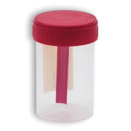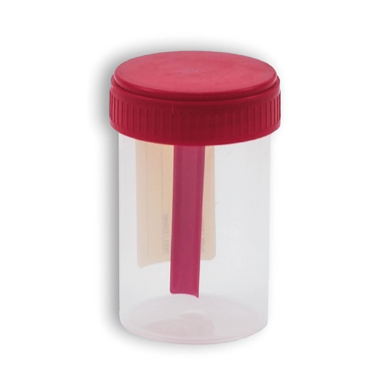 Contenitore per feci con tappo a vite rosso. Destinato esclusivamente alla raccolta e trasporto di campione biologico per effettuare le analisi di laboratorio, in caso di test delle feci.