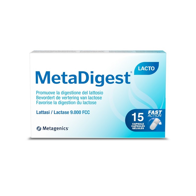 Integratore a base di lattasi appositamente formulato per favorire la digestione del lattosio nei soggetti che mal digeriscono il lattosio di latte, formaggi o altri alimenti. Il dosaggio dell'enzima è molto elevato: 9.000 unita FCC per permettere una efficace e completa digestione enzimatica dello zucchero. Viene utilizzata una lattasi di origine fungina estratta dall'Aspergillus Oryzae la cui azione si esplica in un ampio range di pH (2-10). MetaDigest Lacto comincia la sua azione già nello stomaco. L'enzima utilizzato è ultra purificato e ad alta attività biologica. Senza soia e adatto ai vegetariani.