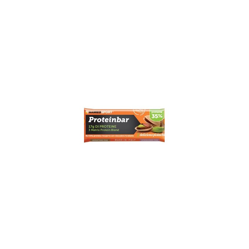 Namedsport barretta proteica a base di Proteine del Siero del Latte Concentrate e Isolate al 35%, con olio di girasole, cremosa crema al gusto pistacchio ricoperta di cioccolato fondente.