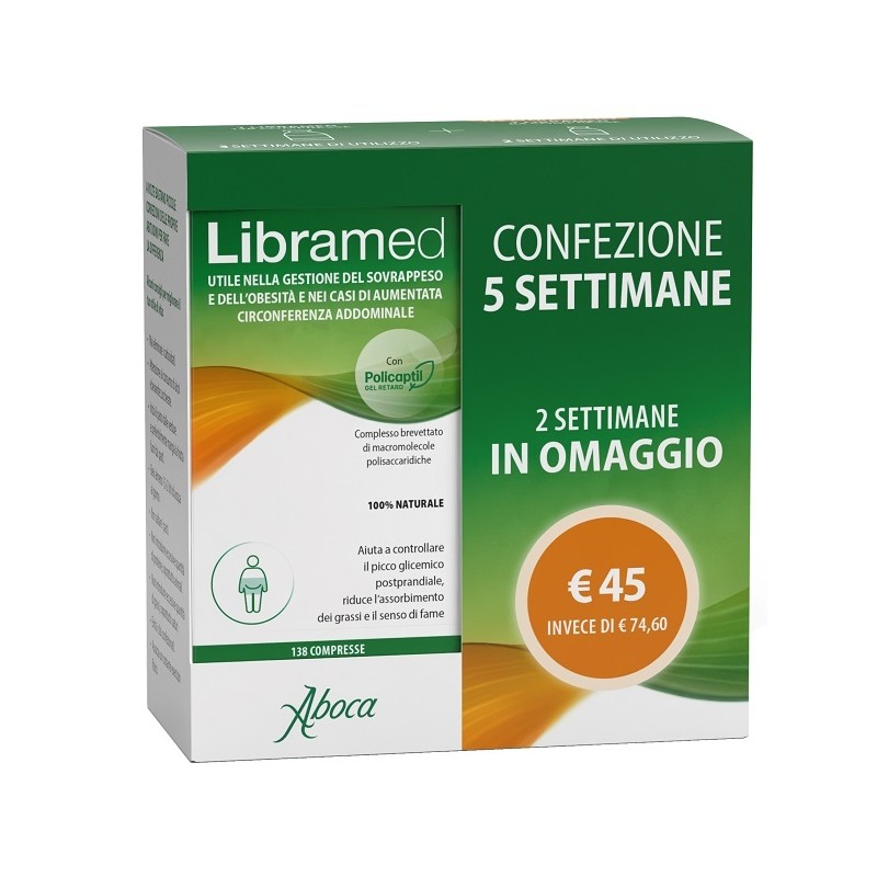 Libramed è un dispositivo medico che aiuta a controllare il picco glicemico postprandiale, rallentando e riducendo l’assorbimento di carboidrati e grassi. Prodotto da Aboca Società Agricola.