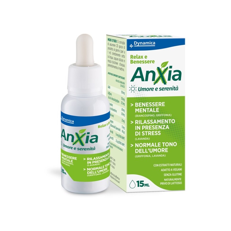 Anxia Dynamica gocce è un integratore alimentare che favorisce il rilassamento e il benessere mentale, il rilassamento in presenza di stress e il normale tono dell'umore.