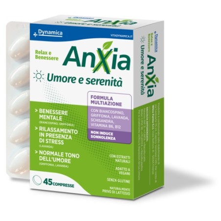 Anxia è un integratore alimentare che favorisce il rilassamento e il benessere mentale, il rilassamento in presenza di stress e il normale tono dell'umore.