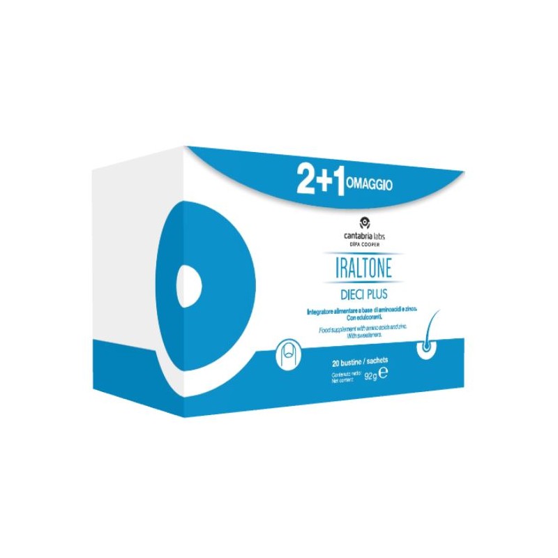 Iraltone Dieci Plus è un integratore alimentare a base di aminoacidi e zinco, con edulcoranti, e contribuisce al mantenimento di capelli, pelle e unghie per mantenerle in buono stato. Prodotto da Difa Cooper.