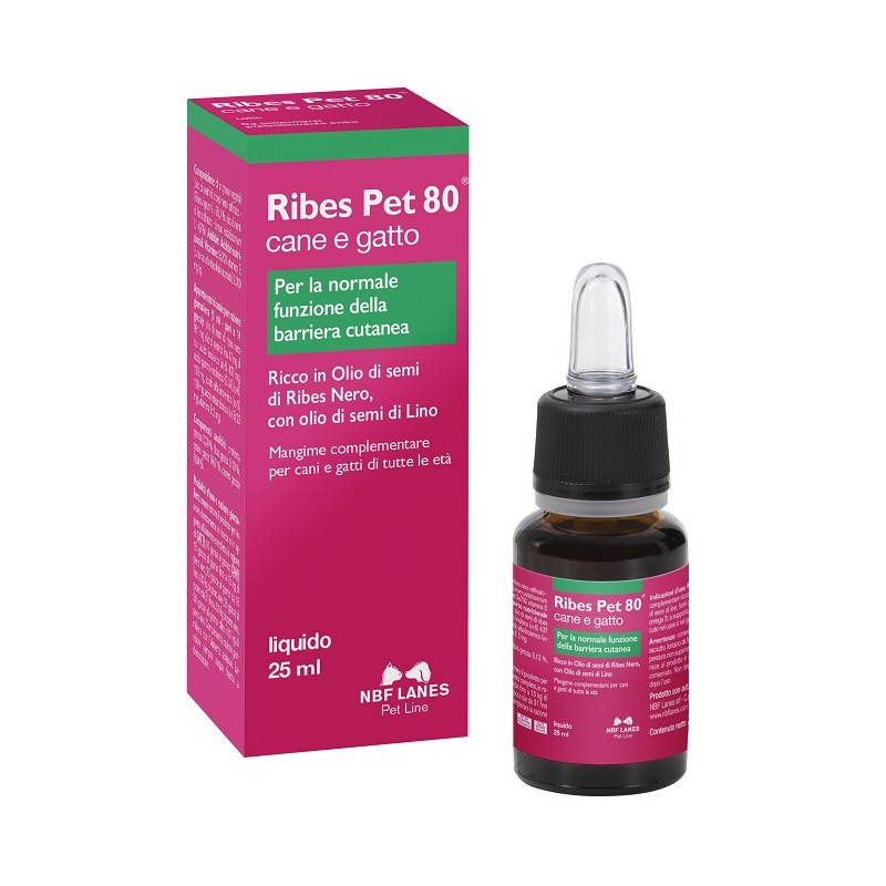 Ribes Pet 80 gocce è un mangime complementare dietetico per il supporto della funzione dermica in caso di dermatosi ed eccessiva perdita di peli nel cane e nel gatto.