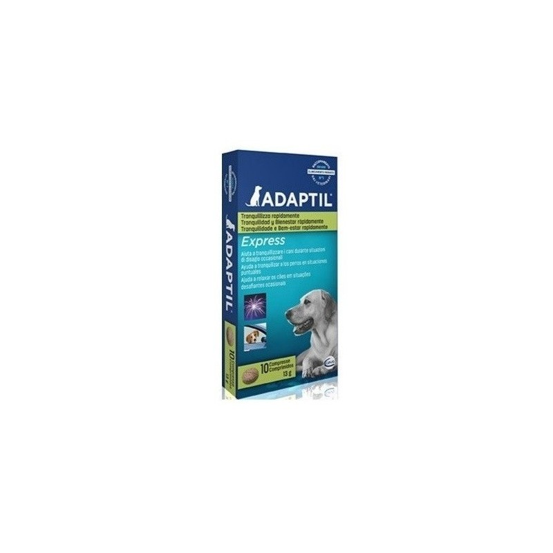 Adaptil Express compresse è dedicato a tutti i proprietari di cani in cerca di una soluzione rapida ed efficace per aiutare i propri cani in situazioni stressanti come: fuochi d'artificio, temporali, rumori forti, paura del viaggio, visita dal veterinario. Grazie alla composizione a base di ingredienti naturali come il GABA (acido-amminobutirrico), L-triptofano, L-teanina, vitamine del gruppo B, fornisce sollievo rapido ai cani durante gli eventi stressanti di breve durata.
