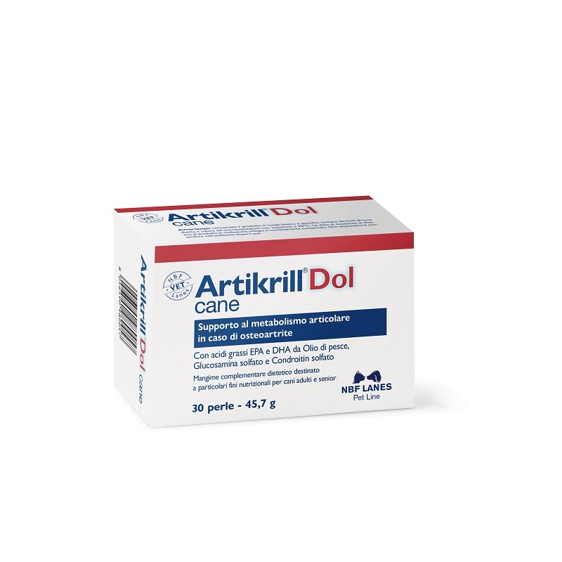 Artikrill Dol cane è un mangime complementare dietetico formulato con acidi grassi omega-3 (EPA) da olio di pesce e con un livello adeguato di vitamina E per il supporto del metabolismo articolare in caso di osteoartrite del cane.