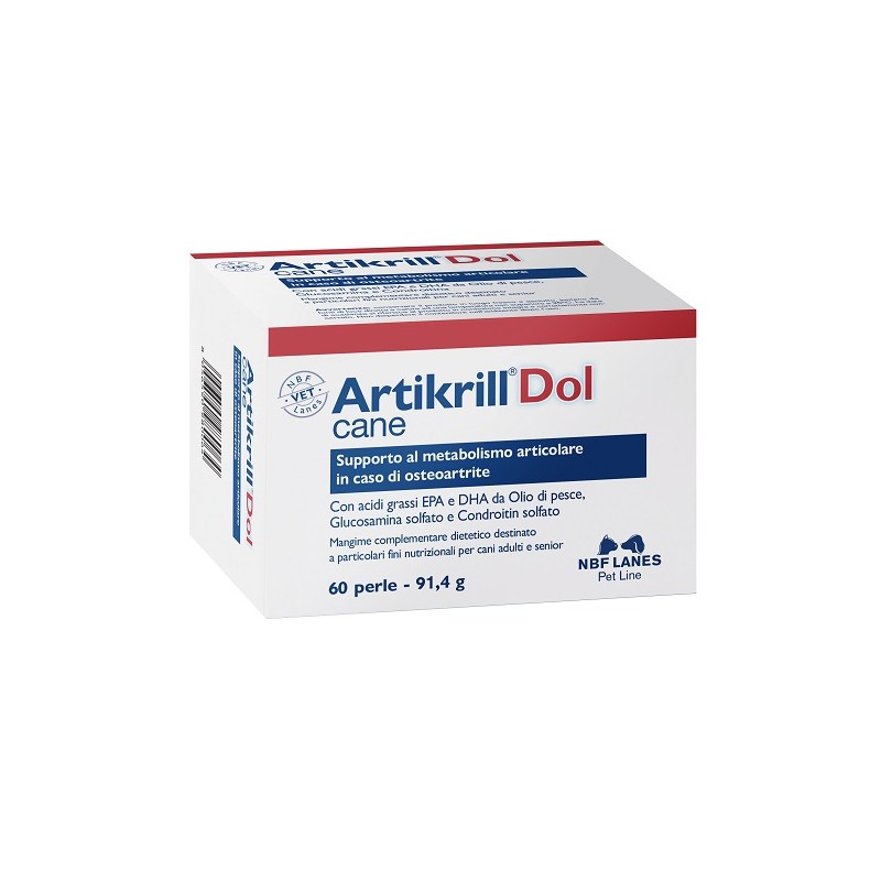 Artikrill Dol cane è un mangime complementare dietetico formulato con acidi grassi omega-3 (EPA) da olio di pesce e con un livello adeguato di vitamina E per il supporto del metabolismo articolare in caso di osteoartrite del cane.