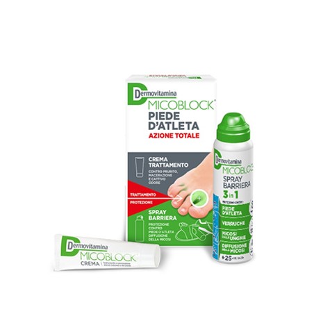 - Dermovitamina Micoblock Spray Barriera 3 in 1, uno spray trasparente e invisibile che svolge una duplice protezione: previene le infezioni della pelle causate da funghi, verruche e batteri e contestualmente aiuta a prevenire la contaminazione crociata con la calzatura e con il calzino, impedendo il diffondersi della micosi. Si asciuga rapidamente, resistente all'acqua, non unge e non macchia.