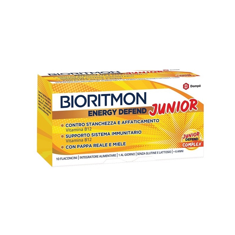 Bioritmon Energy Defend Junior è un integratore alimentare prodotto da Dompe' Farmaceutici a base di vitamina B12, pappa reale e miele (Junior Defend Complex) Integratore alimentare per riduzione di stanchezza e affaticamento e normale funzionamento del sistema immunitario aiuta il normale metabolismo energetico e normale funzionamento del sistema nervoso e della funzione psicologica.